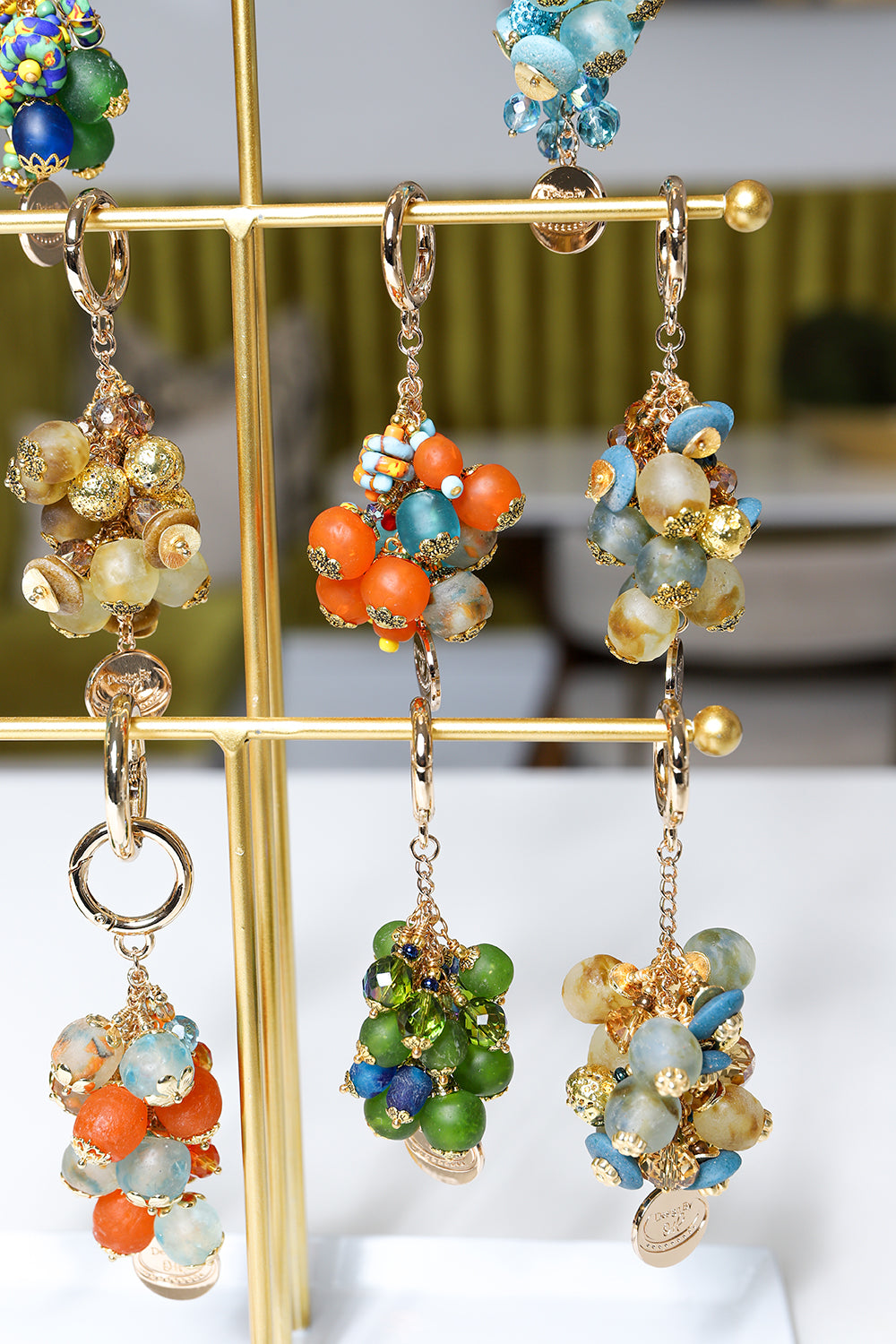 The bag charms are made using recycled glass beads from Ghana, also known as sand cast beads, and other interesting beads and crystals from around the world. As the beads from Ghana are made by hand, no two are the same, making every Design by O.H. bag charm one-of-a-kind. The pieces are an interplay between tradition, modernity, and sustainability with the raw beauty of sand cast beads mixed with crafted glass faceted beads and metal components to create jewelry for handbags, belt hooks, etc.