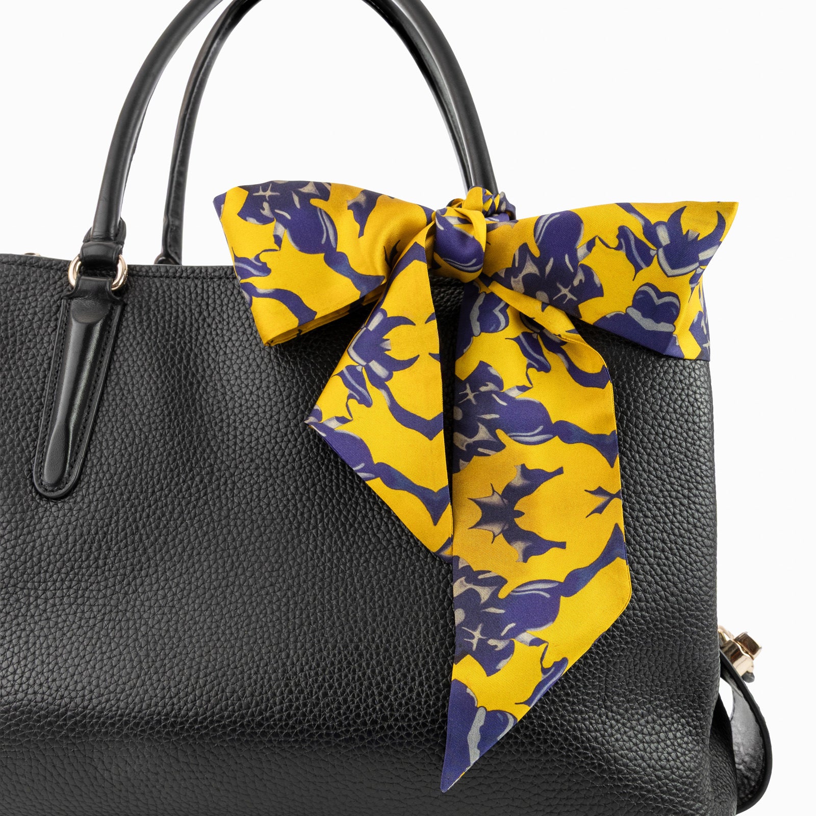 The interesting abstract design of this skinny scarf is based on the pattern of the yellow and royal blue fused recycled glass beads from Ghana used to make the Design by O.H. Okani bag charm. The design was first hand drawn by O.H. with color pencils then digitized. This particular scarf has slightly dark patches that are part of the original hand drawing and adds depth to the design. Tie it on your hand bag handle as a bow or wrap it around the bag handle to add a pop of color. It can also be worn around your wrist or neck, as a hair tie, or even as a belt! For a more dramatic look, pair it with a complementary Design by O.H. bag charm, such as the Okani, or a contrasting bag charm of your choice!